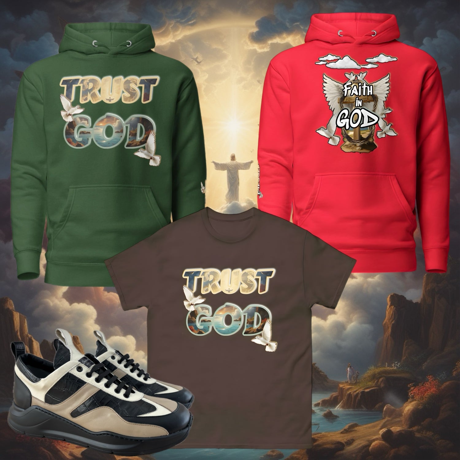 Faith-inspired and boldly designed, the Divine Strength Collection blends comfort with purpose. Featuring cross and dove artwork, each piece is a wearable reminder of hope, peace, and unwavering trust in God.